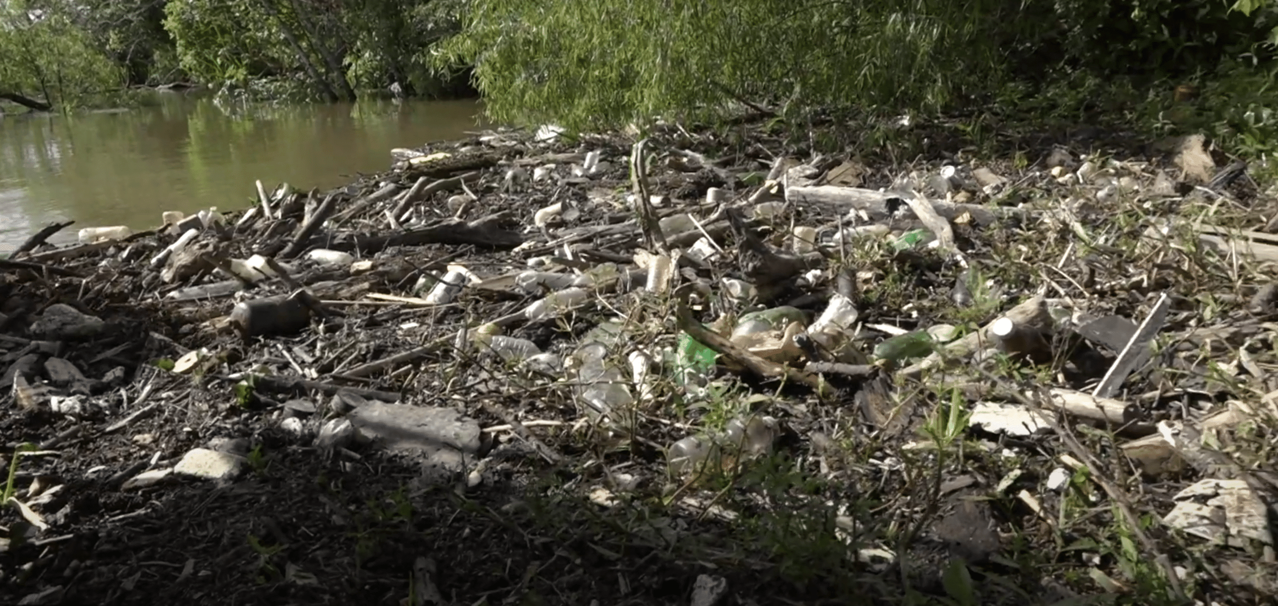 As the discarded trash flows down the river, what isn’t caught up along the way becomes part of