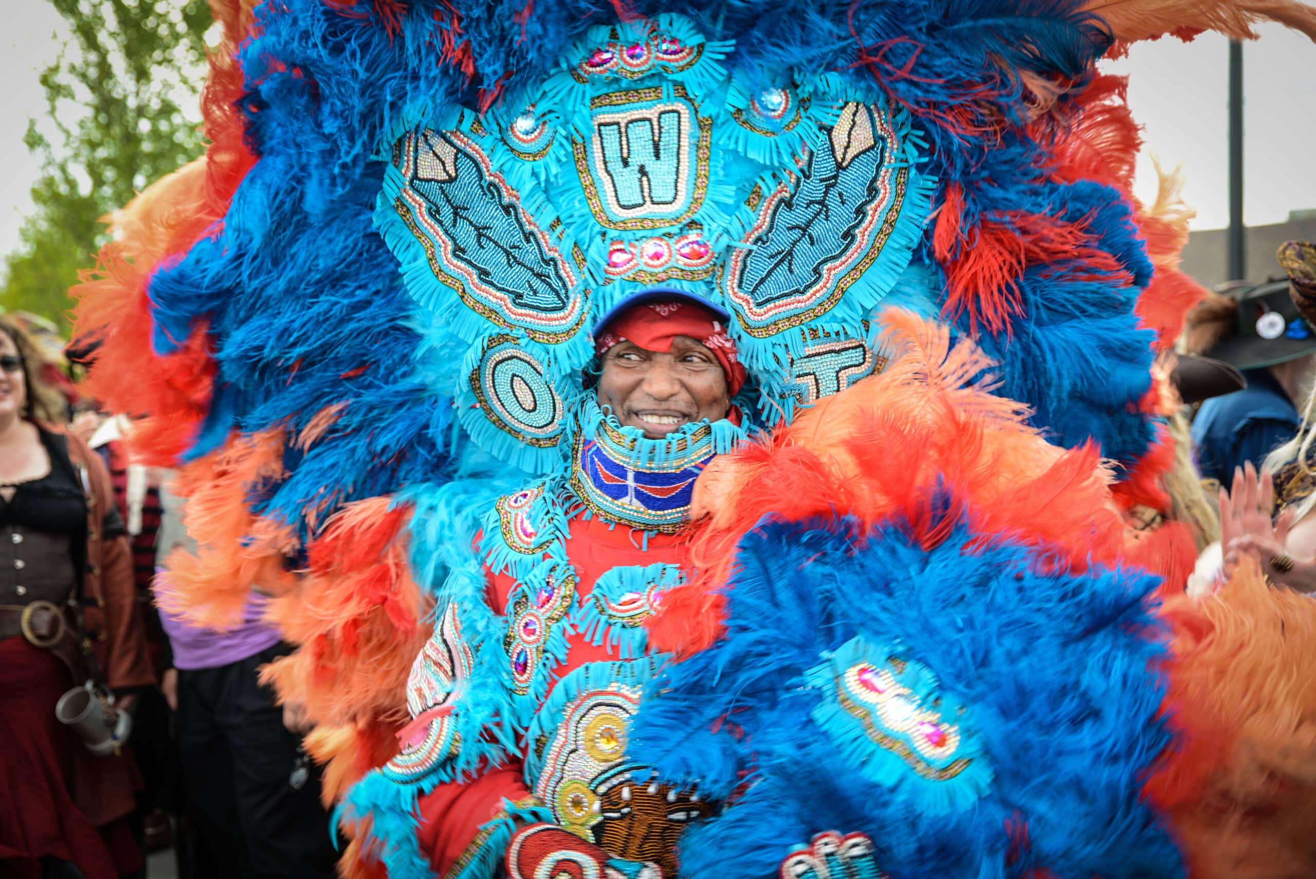 Following the spyboys, the “first flag” comes next in the lineup. This is usually an ornately dressed Indian that carries the token flag of their tribe. The final role following behind the first flag is the “Big Chief”, typically carrying the tribe’s symbolic weapon. The “Big Chief” is in charge of deciding where the tribe goes and which other tribes to meet. These major roles are followed by the entire group, and the entire group is followed by percussionists and revelers.